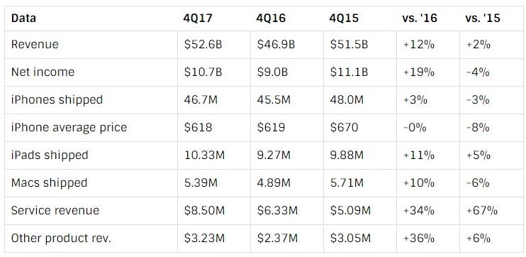 Veniturile trimestriale au depăşit aşteptările, iar vânzările lui iPhone 8 ar fi fost excelente, conform lui Tim Cook. După un 2016 care a părut să aducă o scădere faţă de 2015, acum Apple revine pe plus. Astfel, compania a avut venituri de 52.6 miliarde de dolari în ultimele 3 luni, în creştere cu 5.7 miliarde faţă de anul trecut şi cu 1.1 miliarde faţă de 2015.