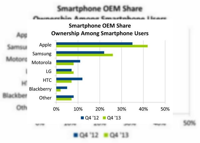 în ce privește ceilalți producători, inclusiv HTC, Motorola sau BlackBerry, NPD report - autorul acestor statistici a stabilit că aceștia se află în continuă scădere, aspect ce conduce la o restructurare a operatorilor de telefonie mobilă. Aici, de remarcat colaborarea Beats Audio cu AT&T pentru a furniza servicii de music streaming. Nu în ultimul rând trebuie amintit faptul că perioada sondajului nu a inclus sezonul cadourilor - luna Decembrie - ce ar fi avut potențialul să schimbe situația în favoarea altor producători.