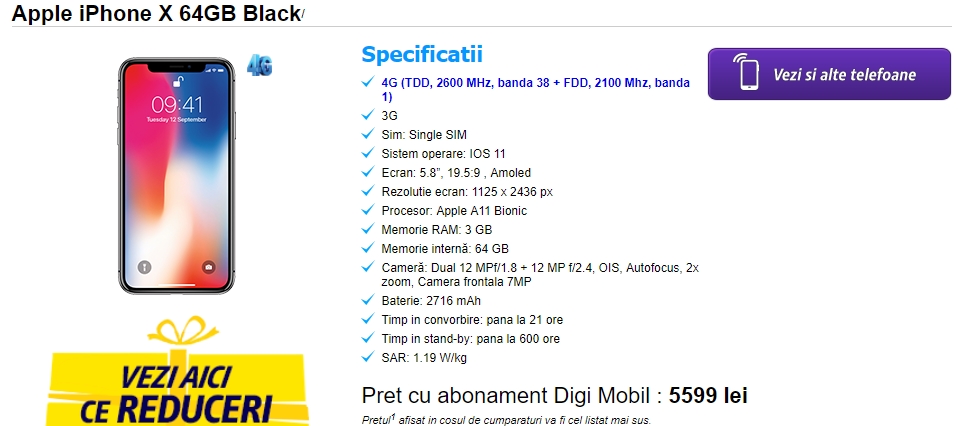 Momentan aceste două modele nu au fost incluse pe lista de terminale disponibile în rate, dar mă gândesc că în următoarele săptămâni ar trebui să fie făcută și această modificare. iPhone X se vinde la Digi pentru suma de 5.599 lei în varianta de 64 GB și dacă ar fi să fac o presupunere, atunci operatorul va vinde acest telefon în 24 rate cu avans de 1.279 lei și o rată lunară de 180 lei - asta pentru că dobânda este 0!