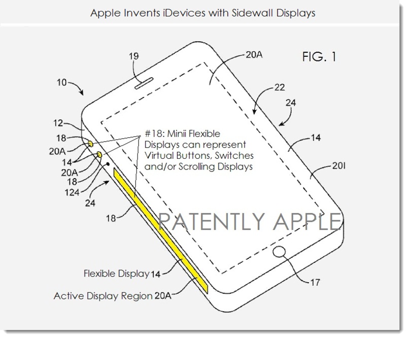 Se zvoneşte de ceva vreme ca telefoanele viitorului vor avea butoane touch laterale de volum şi nu fizice sau că vom face swipe pe lateralul unui terminal pentru a schimba volumul, pentru a face o fotografie, schimba luminozitatea sau alte funcţii de genul. Documentele oficiale menţionează utilizarea unui display flexibil, sub forma unui strat flexibil sau mai multor panouri plasate sub un strat transparent de sticlă sau plastic.