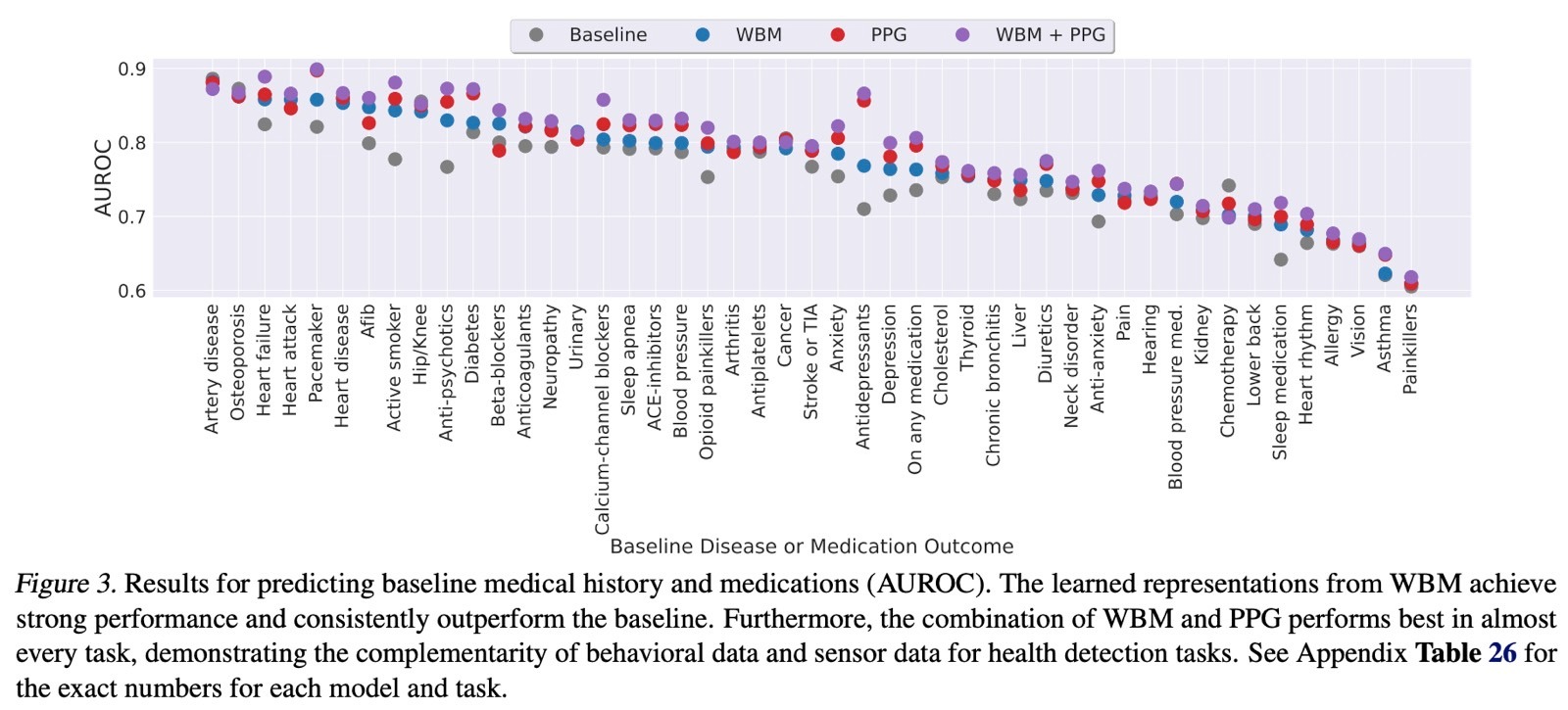 Folosind aceste date, AI-ul poate observa tipare pe termen lung și să identifice devieri subtile de la starea de sănătate normală. De exemplu, ar putea detecta mai devreme riscul de accidentare sau semnele unei infecții. WBM a fost mai precis decât senzorii optici simpli în 18 din 47 de condiții de sănătate testate. Totuși, în unele cazuri, cum ar fi diabetul sau răspunsul la anumite medicamente, senzorii rămân mai eficienți. Combinarea celor două - AI + senzori - oferă cele mai bune rezultate, mai ales în cazuri precum predicția unei sarcini.
