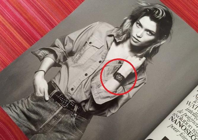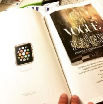 Aflăm că Vogue Paris a publicat un articol de 2 pagini în care detaliază acest device, în vreme ce Vogue America i-a dedicat o gigantică reclama de 12 pagini. Vogue Paris a inclus o serie de fotografii cu fotomodele care poartă ceasul şi îl numeşte pe Apple Watch "o mică revoluţie". Ediţia pe luna martie a lui American Vogue e cea care şochează, prin acea reclamă uriaşă, care include şi prim planuri cu terminalul şi fotografii cu curelele sale.