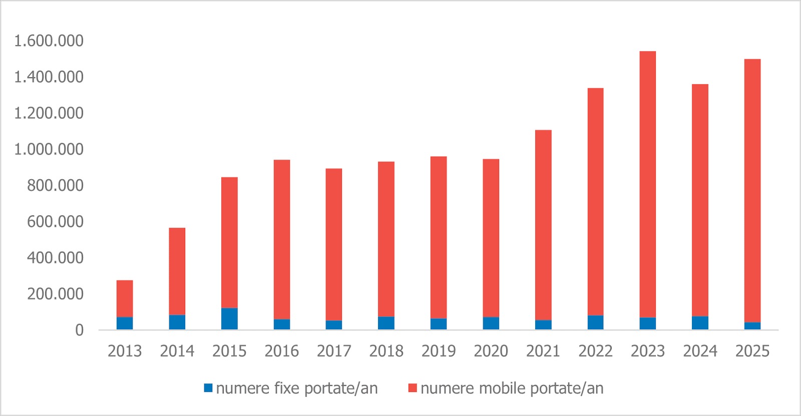 Telefonia mobilă domină net acest segment: 97% dintre portările realizate anul trecut au fost pentru astfel de servicii, ceea ce înseamnă 1.453.878 de numere. În medie, s-au efectuat peste 124.000 de portări în fiecare lună, cu un vârf de peste 170.000 înregistrat în decembrie.