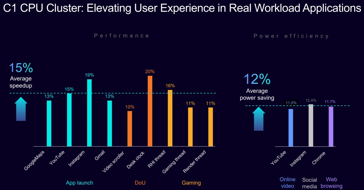 C1-Pro vine ca un all-rounder pentru zona de mid-range și flagship-uri mai accesibile – în gaming aduce până la 16% performanță în plus, iar în consum media e cu 12% mai eficient energetic. În capătul opus al spectrului, C1-Nano e dedicat sarcinilor de fundal și eficienței maxime – până la 26% mai puțină energie consumată și o amprentă fizică redusă cu 2%. Toate aceste nuclee sunt coordonate de un modul nou, C1-DSU (DynamIQ Shared Unit), care optimizează partajarea cache-ului L3 și consumul energetic. În ansamblu, un cluster de procesoare C1 (cu până la 14 nuclee mixate după nevoie) oferă, în medie, cu 30% mai multă performanță și cu 12% mai puțin consum în scenarii reale de utilizare.