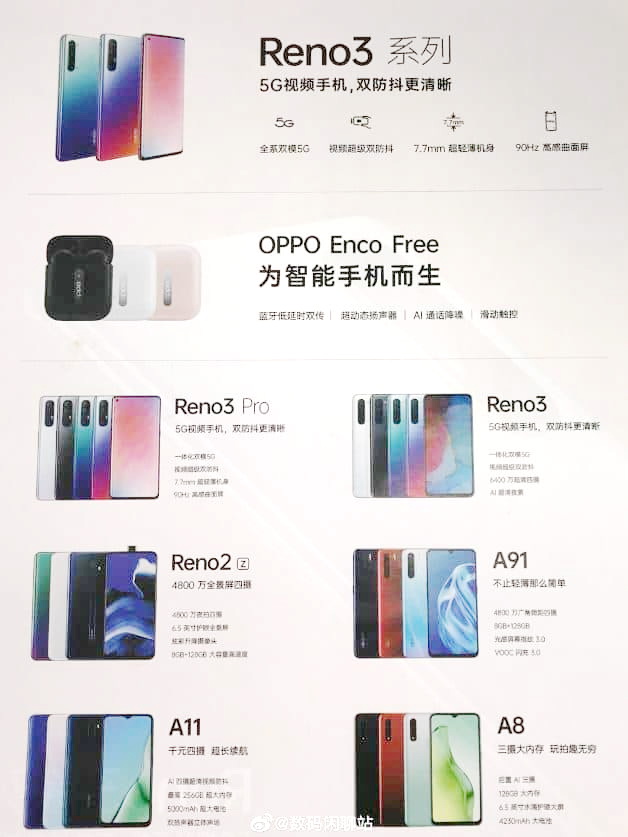 Acum a scăpat pe Weibo un poster promoţional cu telefoanele Oppo ale anului 2020, precum Oppo A91 2020 şi Oppo A8 2020. Nu vedem decât designul lor şi câteva dotări de bază şi apar pe lista modele ca Oppo Reno 3, Reno 3 Pro, A91, A11 şi A8, plus Reno 2. Pare să fie pliantul unui operator sau retailer. Nu aş zice că se schimbă prea mult lucrurile ca design în 2020, iar camerele principale rămân aliniate vertical în spate, în vreme ce cameră selfie de pe A11, A9 şi A91 este într-un breton picătură.