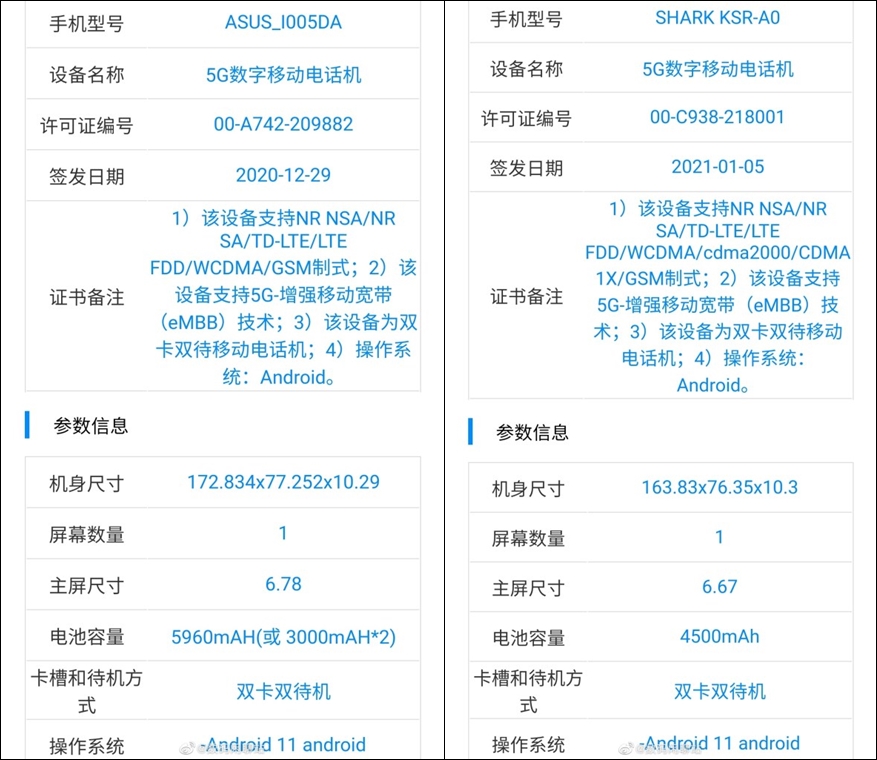 Ieri aflam noi informații despre Black Shark 4, viitorul smartphone de gaming de la Xiaomi. Astăzi, acesta a apărut listat pe site-ul de certificări MIIT din China alături de ASUS ROG Phone 5. Cele două telefoane de gaming au fost recunoscute după numerele de model ASUS_I005DA, respectiv SHARK KSR-A0 și rulează Android 11 direct din cutie.