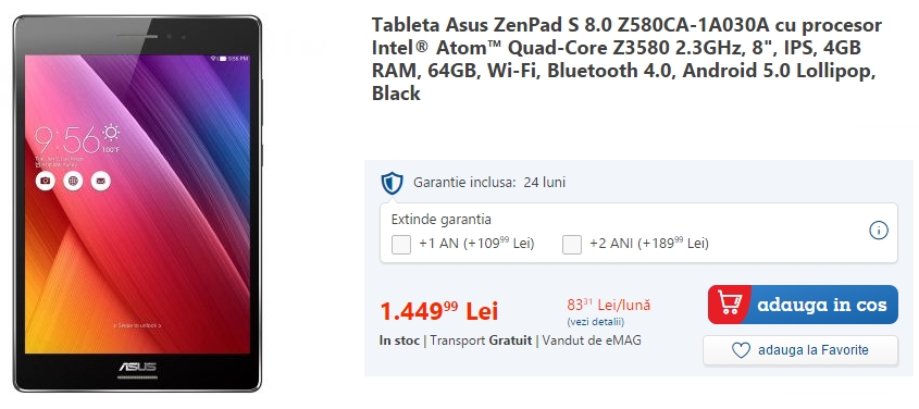 Pe lângă modelul ZenPad 7, recent în redacția Mobilissimo.ro a poposit și tableta ZenPad S 8.0, un device mult mai avansat din punct de vedere tehnic. Acest device tocmai ce a fost listat și de către eMAG, magazin online ce vinde produsul la un preț de 1.449 lei, sumă ce dezvăluie că avem de-a face un un device high-end.