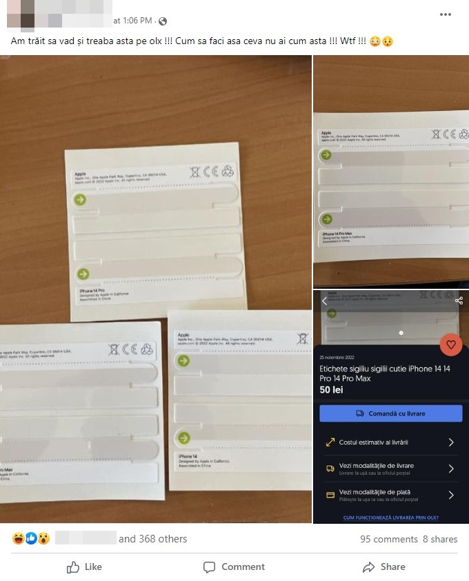 Capturile au fost postate de către un utilizator în grupul de Facebook Apple Romania. Se pare că pe OLX sunt vândute etichete / sigilii pentru cutiile de iPhone 14, 14 Pro și 14 Pro Max. După cum spun mai mulți utilizatori în zona de comentarii, sursa acestor etichete ar fi site-urile care comercializează produse din China precum AliExpress.