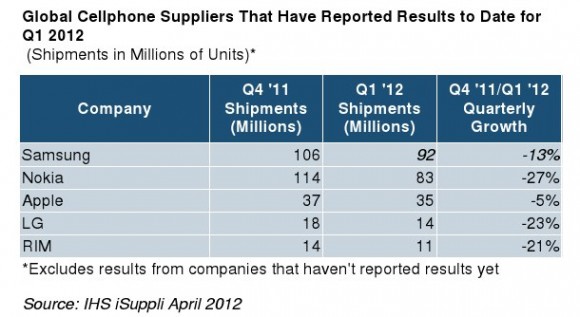Istoria consemnează că Nokia a fost cel mai mare vânzător de telefoane mobile în intervalul 1998 - 2011, domnia încheindu-se în acest an. în zona de smartphone-uri, lucrurile nu arată bine pentru nici o companie: Apple a scăzut cu 5% în trimestrul 1 2012 față de trimestrul 4 2011, în vreme ce Samsung a pierdut 11%. începutul anului e întotdeauna o perioadă moarta, iar Nokia a avut un picaj mare de vânzări, cu 39%, în vreme ce RIM, producatorul de Blackberry-uri a înregistrat la rândul său o scădere cu 21% a vânzărilor. și LG se afla pe lista neagră, cu scădere de 19%.
