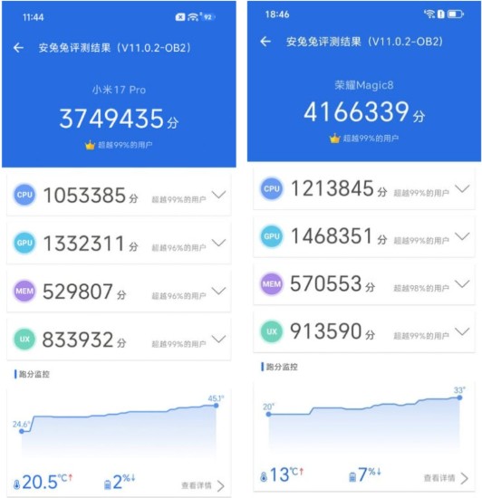 HONOR domină şi la sub-teste: CPU, GPU, memorie şi UX. Care e secretul? Răcire mai bună? Throttling mai bine controlat? Mai mult RAM? Stocare mai nouă? Atenţie mare şi la consum totuşi: HONOR a pierdut 7% din baterie în test, iar Xiaomi doar 2%. Şi la capitolul termic sunt diferite treburile: Magic 8 a urcat cu 13 grade Celsius, iar Xiaomi cu 20.