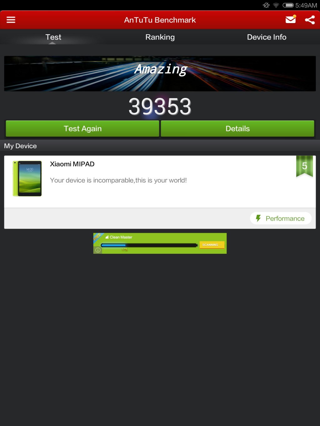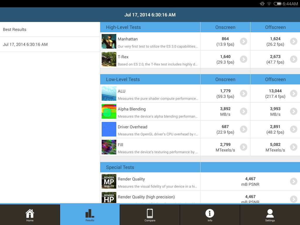 Dintre acestea Xiaomi Mi Pad nu a putut rula Quadrant, Geek Bench 3, BrowserMark și SpeedTest.net. Restul au funcționat fără probleme totuși. în AnTuTu am obținut 39353 puncte, peste cele 34.074 puncte ale performantului Samsung Galaxy Note Pro 12.2, care vine cu un CPU Exynos 5 Octa (8 core). De dragul comparației între Tegra K1 și predecesorul său, Tegra 4, aflați că ASUS Transformer Pad TF701 (model cu Tegra 4) atinge 26893 puncte în AnTuTu.