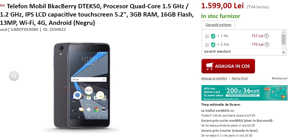 Doar o zi a trecut de la anunțul lui BlackBerry DTEK50 și iată că telefonul este deja disponibil la vânzare pe plan local, prin intermediul celor de la evoMAG.ro ce afișează un preț de 1.599 lei pentru acest dispozitiv. Așa cum aflați din articolul de ieri, telefonul de față include la pachet și software-ul DTEK ce se va ocupa cu securitatea, monitorizând comportamentul aplicațiilor, dar și oferind sugestii pentru creșterea nivelului de siguranță.