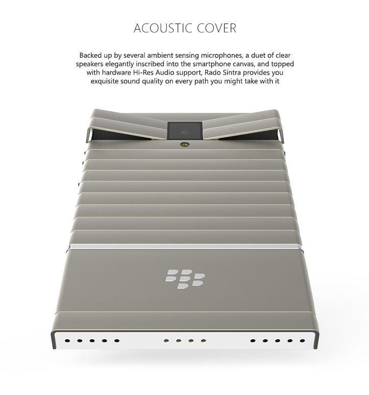 Rezultatul e un telefon care ar face Vertu gelos, numit BlackBerry Rado Sintra. Din păcate handsetul e doar în faza de concept, dar el aduce câteva elemente interesante de design, precum acele aripi "gullwing", care amintesc de un automobil Mercedes Benz McLaren. Telefonul vine cu butoane metalice foarte discrete și folosesc ceramică Rado Hi-Tech ca material, plus aliaj de titaniu și cristal de safir.