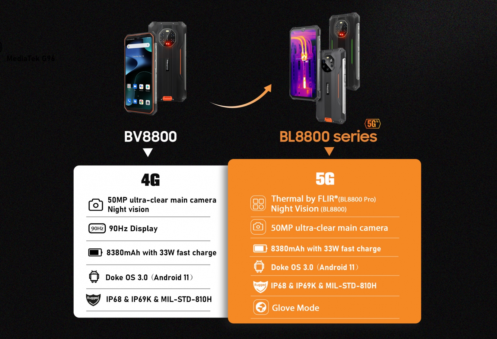 Aceleași dotări mai sus menționate se păstrează și pentru Blackview BL8800 series, doar că avem aici un procesor nou, unul echipat cu modem 5G. Are și acea cameră cu termoviziune de mare ajutor, iar design-ul "alien" din spate se păstrează și aici. În plus, există și un mod prin care telefonul poate fi utilizat cu mânuși, de genul celor folosite în construcții.