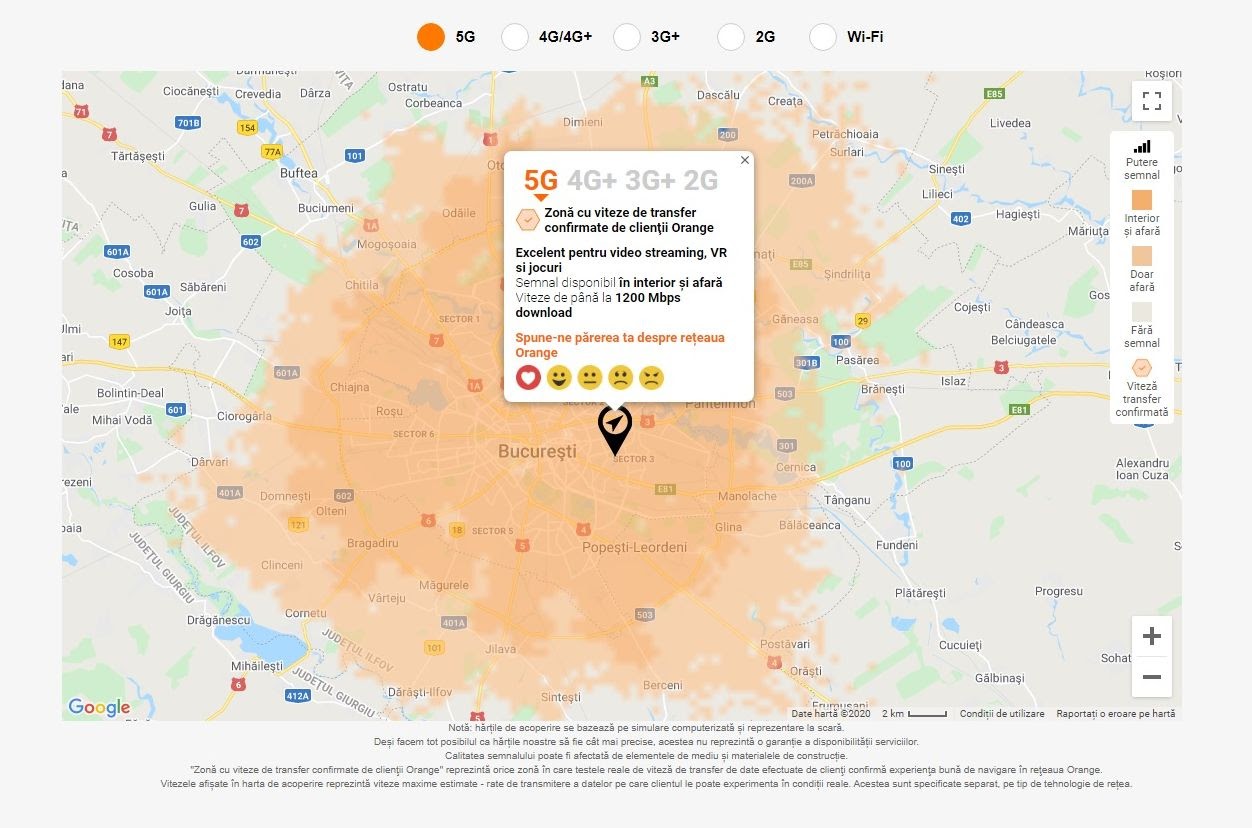 Cine are un telefon compatibil 5G poate atinge până la 1.2 Gbps viteză maximă de download. În plus, reţeaua Orange 5G este disponibilă pe lângă Bucureşti şi în oraşe ca Otopeni, Voluntari, Cluj-Napoca, Iaşi, Timişoara, Braşov, Constanța şi Mamaia. Extinderea infrastructurii 5G se adăugă investiţiilor constante pe care Orange le desfăşoară în acest an pe fondul creşterii consumului de date mobile cu peste 40% în T2 2020 faţă de T2 2019. 98.86% din populaţia ţării beneficiază de acoperire 4G în reţeaua Orange, în vreme ce acoperirea 4G+ a fost extinsă şi este acum la cota de 59.63% din populaţia ţării.