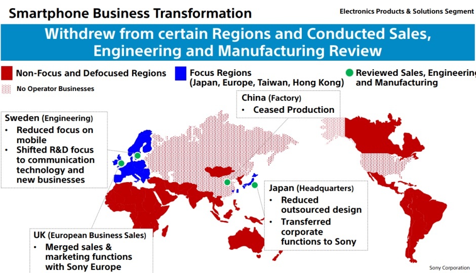 Recent cei de la Sony au luat și decizia de a-și concentra atenția cu segmentul smartphone în 4 regiuni cheie din lume și anume Europa, Taiwan, Japonia și Hong Kong după cum ne arată și prezentarea de mai sus. Există menționate aici și regiuni din care cel mai probabil Sony își va retrage smartphone-urilor pentru a reduce pierderile.