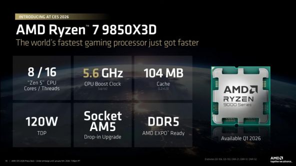 AMD a lansat la CES 2026 noul CPU Ryzen 7 9850X3D, un procesor care ia tot ce era deja bun la 9800X3D și mai împinge un pic limita — fără să schimbe rețeta prea mult. E același chip cu 8 nuclee și 16 fire de execuție, aceiași 96MB de L3 cache pe care gamerii îi apreciază pentru latențele mici în jocuri, dar cu un boost semnificativ de frecvență: 5.6GHz față de 5.2GHz cât atingea 9800X3D.