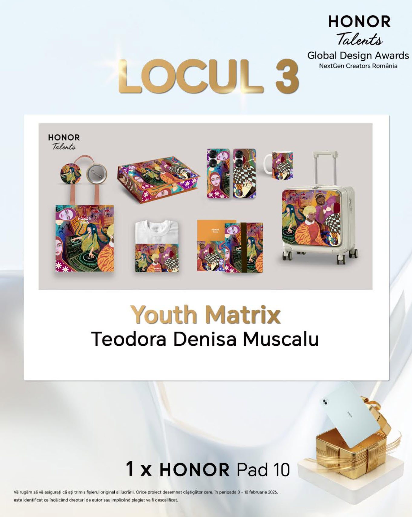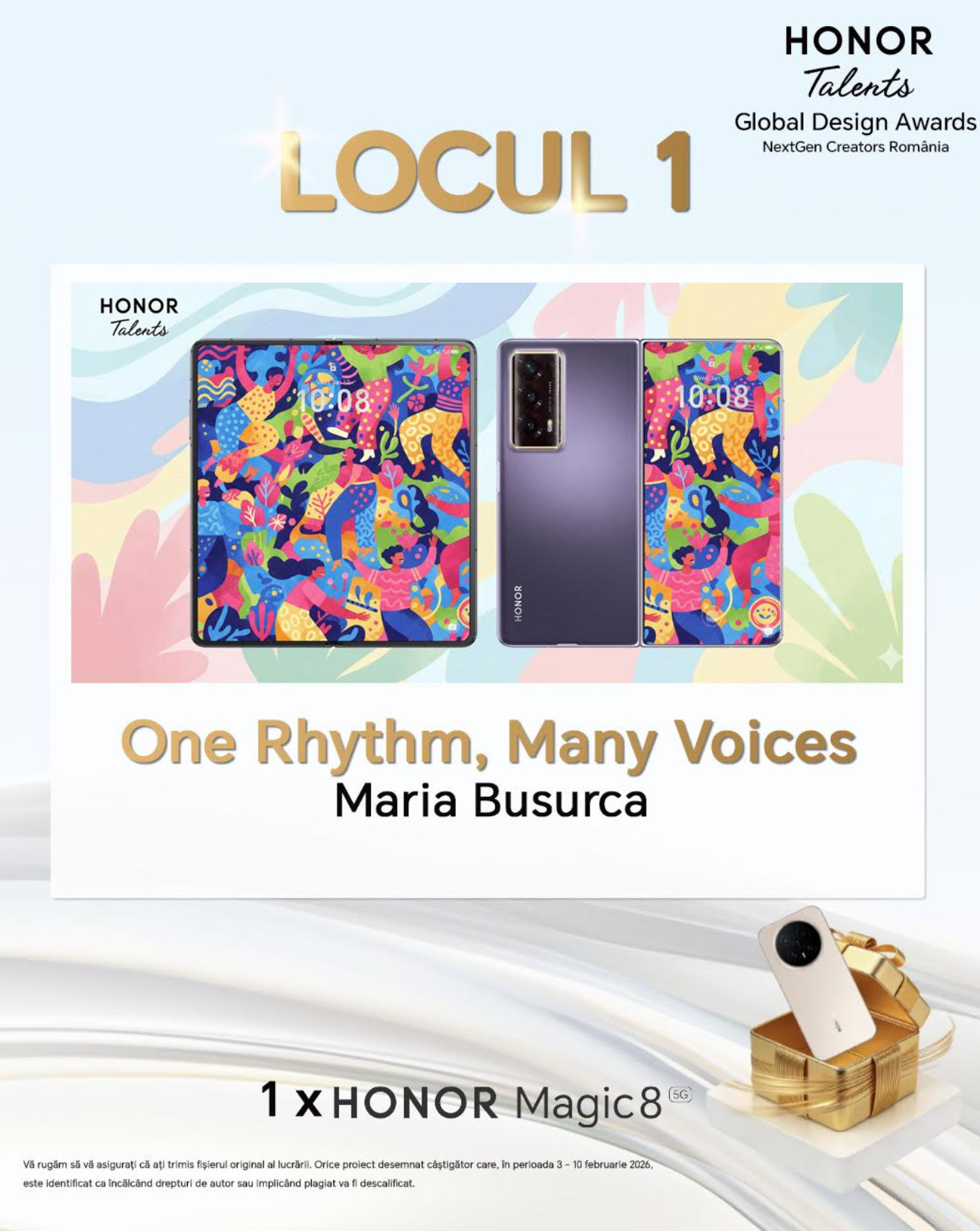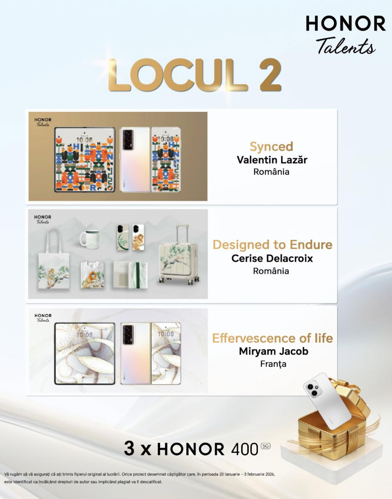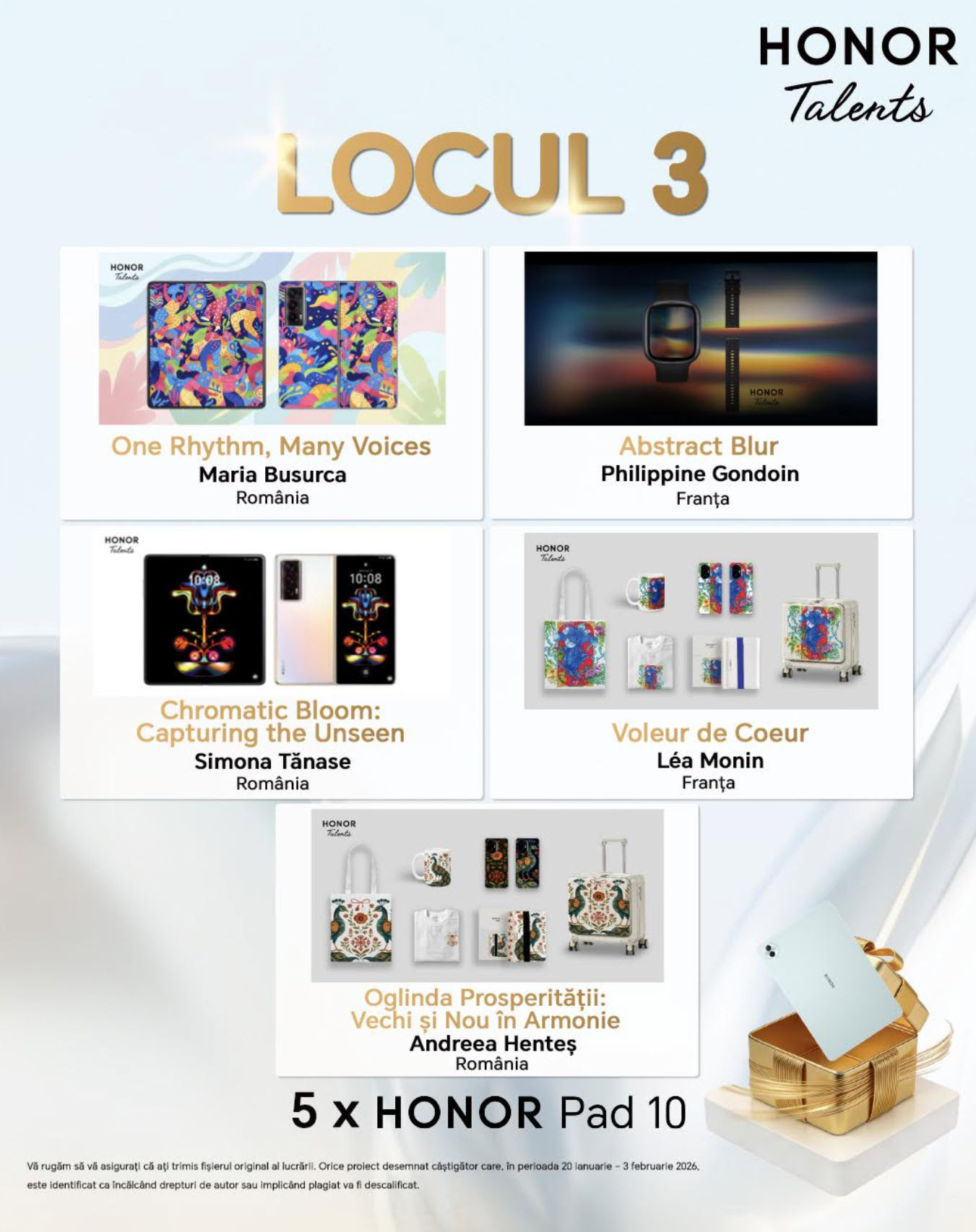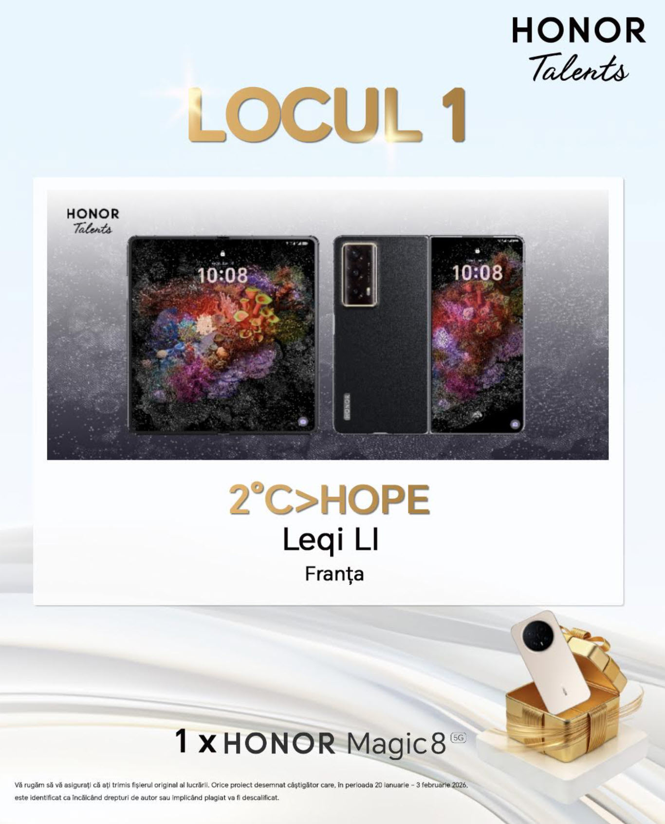 Ce beneficii au finaliştii? Expunere locală şi internaţională, interacţiuni directe cu echipe globale HONOR de design, cercetare şi dezvoltare. Lucrările câştigătoare vor fi prezentate publicului din România în cadrul unei expoziţii planificate pentru jumătatea anului 2026.