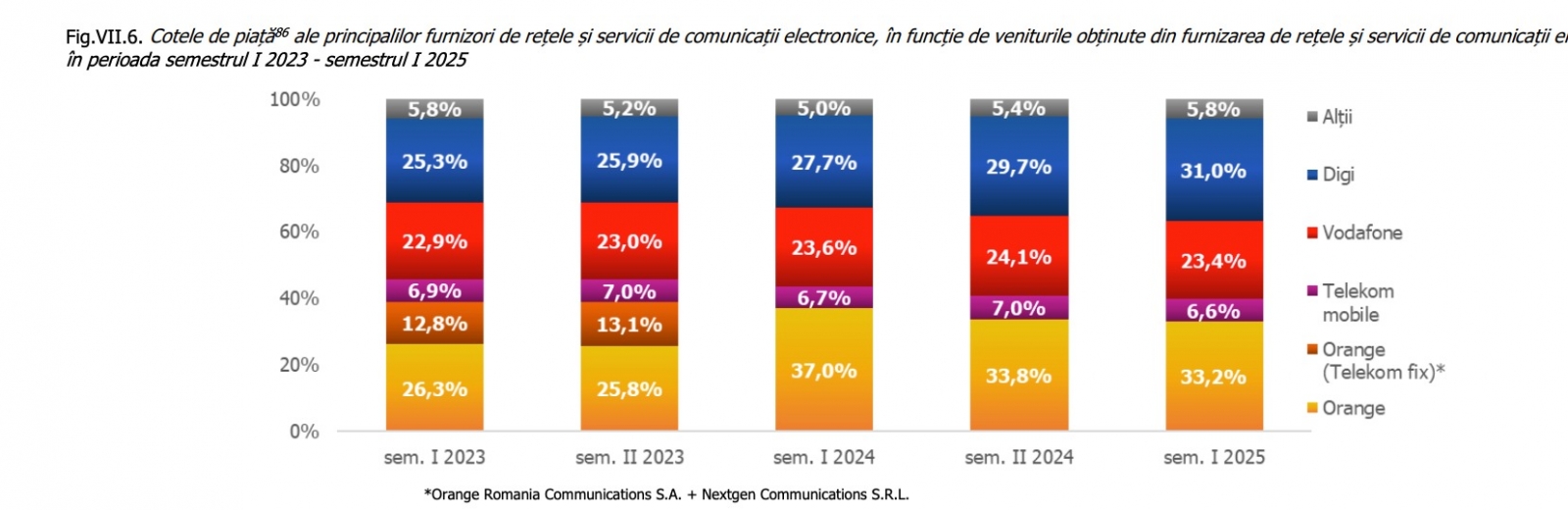 Orange rămâne liderul pieței, cu o cotă de 33,2%, dar în scădere vizibilă față de vârful de 37% atins în semestrul I din 2024. Vodafone se menține relativ constant, cu o cotă de 23,4%, iar Telekom Mobile, care a ieșit din piața românească, a avut o cotă de doar 6,6%.