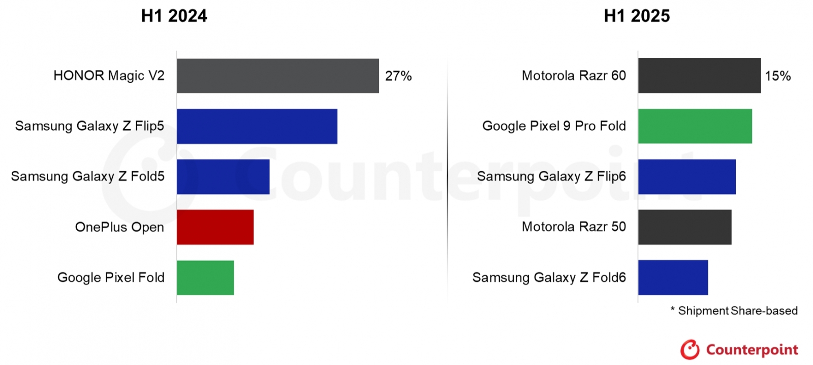 Pregătește și un triplu-pliabil care să mai compenseze din scăderea vânzărilor de pliabile carte, verticale, iar legat de materialul Counterpoint, vedem mai sus cum arată top cele mai vândute pliabile în prima jumătate a anului 2024 vs. prima jumătate a anului 2025.