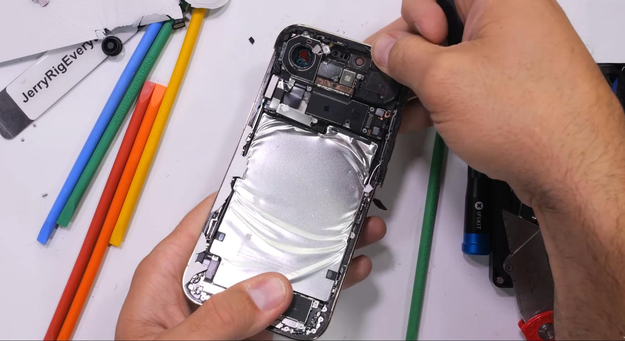 Spatele telefonului e relativ uşor de scos, ai nevoie doar de căldură, pană de chitară şi de scos două şuruburi pentalobe. Bateria de 3149 mAh ocupă grosul spaţiului de la interior. Sunt la vedere şi magneţii MagSafe şi bobinele de cupru, care ajută la încărcarea wireless. Incinta din metal a bateriei i-a permis să supravieţuiască şi după tratamentul dur aplicat de Jerry.