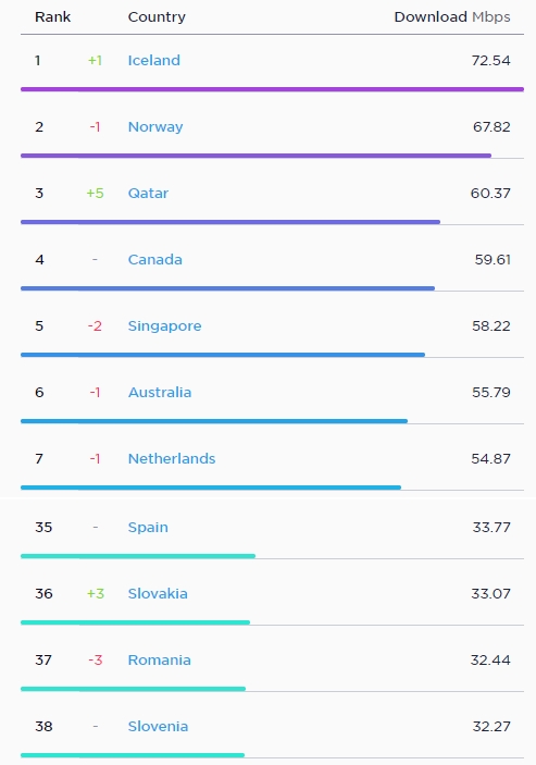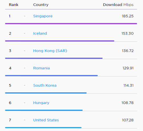Unde stăm foarte, dar foarte bine este viteza la internet fix acolo unde rezultatul mediu este de 129.91 Mbps la download, respectiv 97.93 Mbps la upload - cifre ce ne plasează pe locul 4 mondial. Înaintea noastră se poziționează Singapore (185.25 Mbps DL), Islanda (153.30 Mbps) și Hong Kong cu o viteză medie la download de 136.72 Mbps.