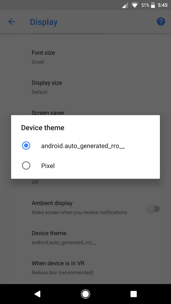 Se vor modifica iconițele, wallpaper-urile, dar și elemente de UI cu scopul de a face din experiența Android una ceva mai personală pentru utilizator. Deja cei care și-au instalat build-ul beta Android O pe smartphone-ul Pixel sau Nexus pot vedea opțiunea 'Device Theme' în secțiunea setări Display. Rămâne de văzut dacă aceste fișiere RRO ce dezvăluie inițiativa Google de a aduce teme pe Android se vor regăsi și în următoarele release-uri de dinaintea versiunii finale.