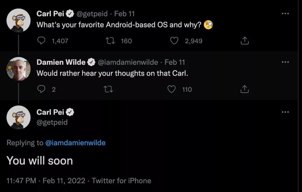 Informaţiile au fost extrase dintr-un interviu cu Carl Pei, unde au apărut detalii despre produse precum accesorii smartphone, power bank-uri, ceasuri inteligente şi brăţări de fitness. Acum Carl a făcut şi câteva postări pe Twitter care duc mai degrabă în direcţia unui smartphone Android. Totul a început cu Pei întrebându-şi followerii de pe Twitter care e versiunea lor preferată de Android. Apoi a scris că "a revenit la Android", primind chiar răspunsuri de la conturile oficiale Android şi Snapdragon.