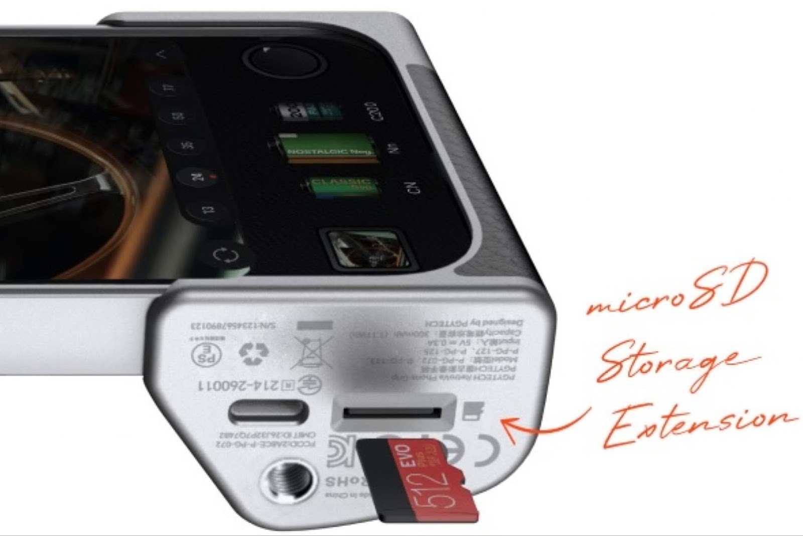 Are şi slot microSD şi obiectiv telephoto 2.35X, acesta fiind factorul de mărire a zoom-ului optic. Finisajul e din piele granulară şi se inspiră de la camerele retro. Butonul shutter fizic are textura metalică şi avem şi un buton multifuncţional şi un buton-manetă pentru zoom, plus un buton rotativ. Mai are şi slot microSD, port USB-C 3.1 şi suportă inel adaptor pentru reglaj de focus şi zoom.