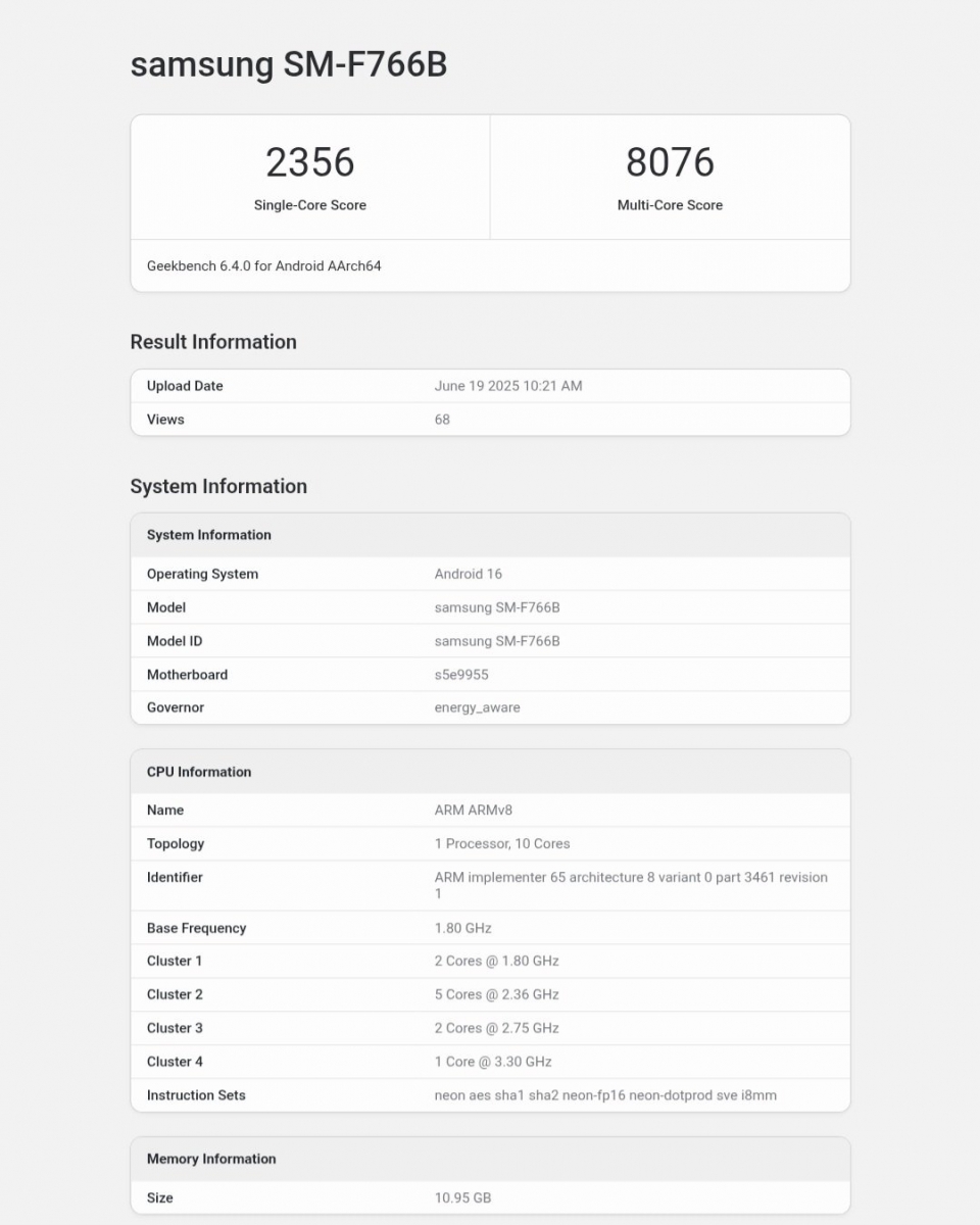 Ca reminder, acesta va fi primul pliabil Samsung ce va opta pentru un procesor Exynos, după ce în trecut toate modele din lineup avea Snapdragon. Cum se descurcă în GeekBench? Varianta testată cu 12 GB RAM obține scoruri mari, de 2356 puncte single-core și 8076 puncte multi-core. În comparație, Flip6 cu Snapdragon 8 Gen3 obținea 1581 puncte single-core, respectiv 6488 puncte multi-core, semn că upgrade-ul există.