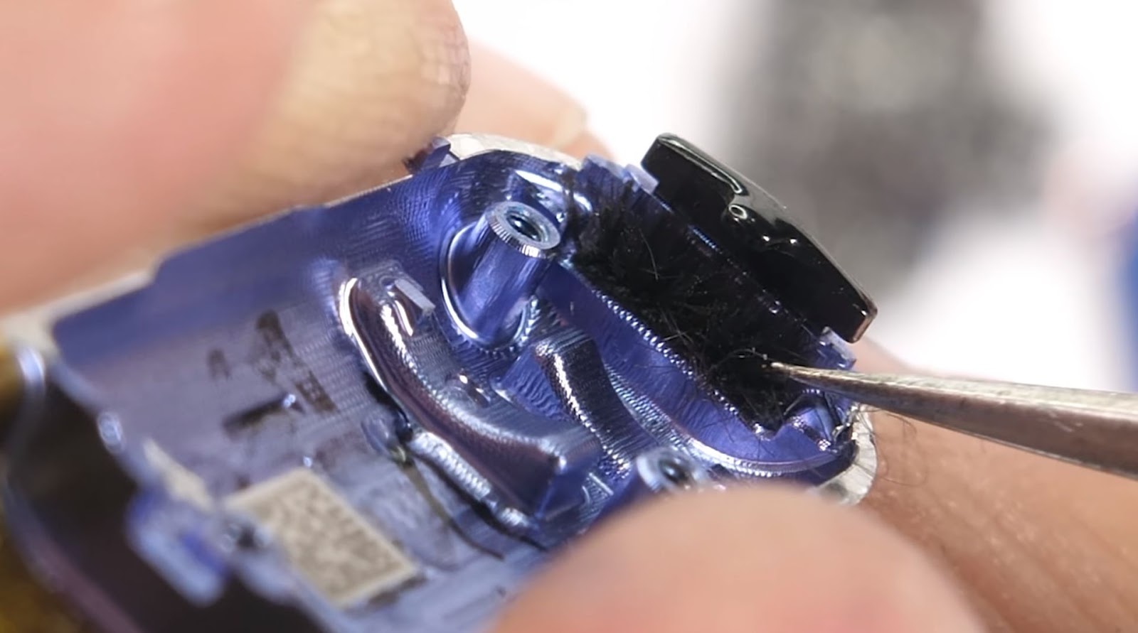 Jerry a vânat cu mare grijă perişorii din nylon care curăţă mizeria şi era gata să îi rateze. Sunt plasaţi pe lateralul balamalei şi arată ca nişte fire de barbă tunse, mici, scurte şi cu desime mare. Întreaga disecţie o vedeţi pe YouTube, iar balamaua e cu adevărat o realizare inginerească, peste cea de pe Moto RAZR sau Galaxy Fold.