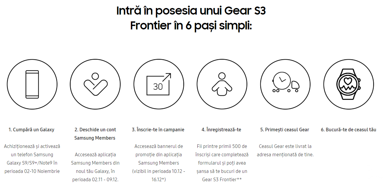 Această promoție presupune oferirea unui smartwatch Samsung Gear S3 Frontier cadou la achiziția unui smartphone high-end Samsung. Astăzi descoperim regulamentul oficial și pe această cale avem detaliile complete ale campaniei. Ei bine, un lucru ce trebuie menționat din start este acela că DOAR 500 CEASURI vor fi oferite cadou primilor 500 utilizatori care se înscriu în aplicație.