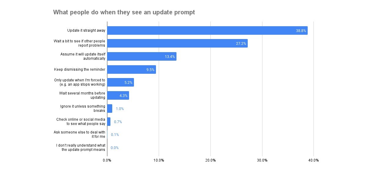 Văd că şi 61% dintre oameni fac ca mine şi stau ceva vreme să aştepte să vadă dacă e vreun bug. E drept că 38.8% cum văd notificarea au şi făcut update-ul. Dintre cei care au ales să NU facă update-ul, 28% nu au absolut nimic împotriva lui şi nici vreun motiv de menţionat. 72% au totuşi ceva de împărţit cu acest release.