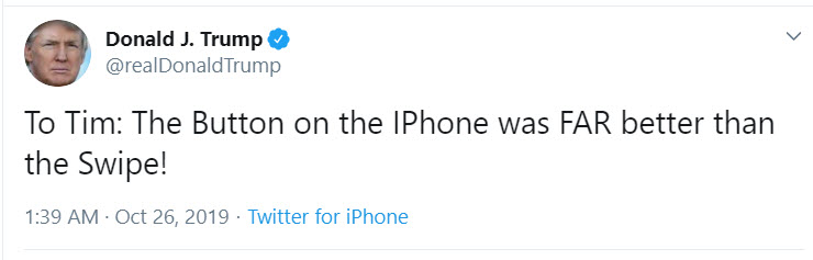 Ce nu înţelege Trump e că Apple nu e un DJ de discotecă din Costineşti, să îi ceri o "piesă" în playlist sau schimbări de gen. Postarea lui Trump spune că butonul de pe iPhone era MULT mai bun decât gesturile swipe. Măcar acum nu l-a mai numit pe Tim Cook "Tim Apple", cum făcuse la un eveniment de acum câteva luni. Apple a renunţat la butonul Home acum 2 ani, odată cu iPhone X, trecând la gesturi swipe de navigare.