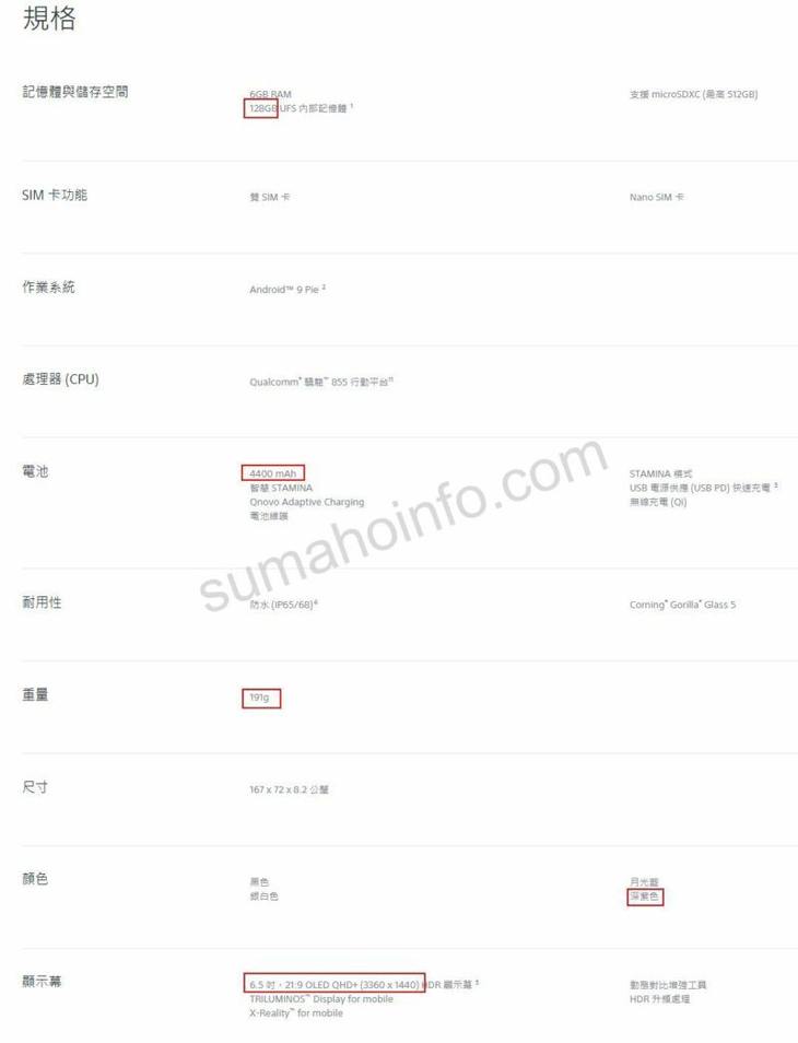 Pe această cale aflăm că smartphone-ul vine echipat cu un ecran OLED uriaș de 6.5 inch ce adoptă rezoluție QHD+ de 3360 x 1440 pixeli și un aspect 21:9 pentru imagine, standardul folosit la Hollywood pentru producțiile cinematografice. Mai are și 6 GB RAM, procesor octa-core Qualcomm Snapdragon 855 și 128 GB spațiu de stocare + slot microSD.