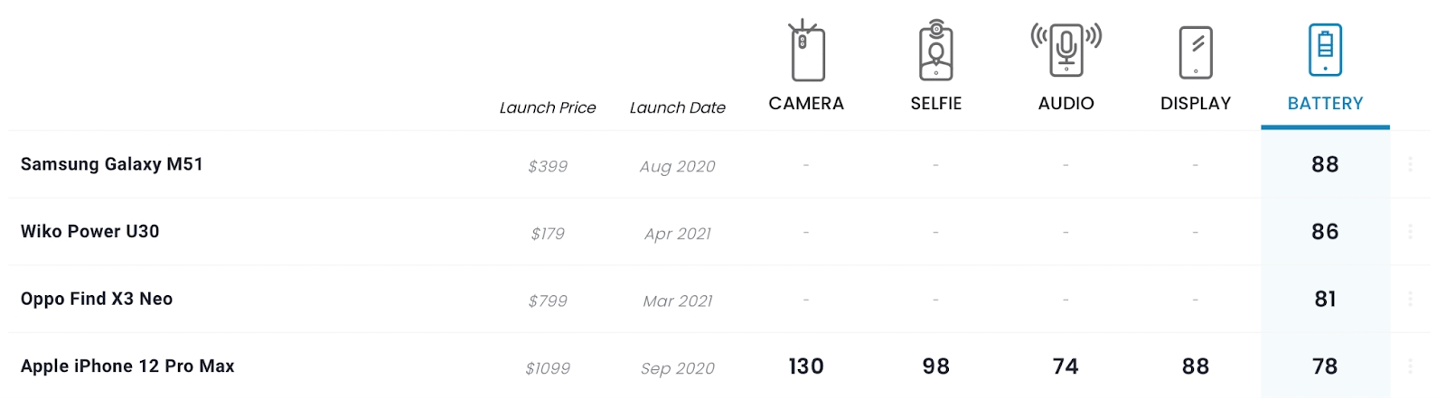 Pe locul întâi se afla Samsung Galaxy M51, cu un scor de 88 de puncte la testul de baterie, urmat de telefonul franţuzesc Wiko Power U30 şi apoi de Oppo Find X3 Neo. Pe locul 4 avem un iPhone 12 Pro Max, cu 78 de puncte. DxOMark este o companie franceză care o bună perioadă de timp a fost prezentată ca reper şi motiv de laudă de fiecare dată când se lansa un telefon. Ei făceau teste de culori, zoom, captura low light, stabilizare pentru camerele de pe telefoane şi la final acordau un scor. Ulterior au separat secţiunea Selfie cu o notă separată şi au început să testeze şi display-uri şi difuzoare.