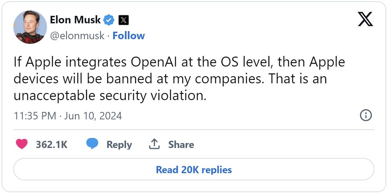 Nu toată lumea e mulţumită după prezentările Apple de la WWDC 2024. Şeful nemulţumiţilor este chiar Elon Musk, deranjat de faptul că Apple a pus ChatGPT pe iOS 18 și nu Grok. Urmărea? Interdicţia de dispoziţie Apple în rândul zecilor de mii de angajaţi Tesla şi nu numai.