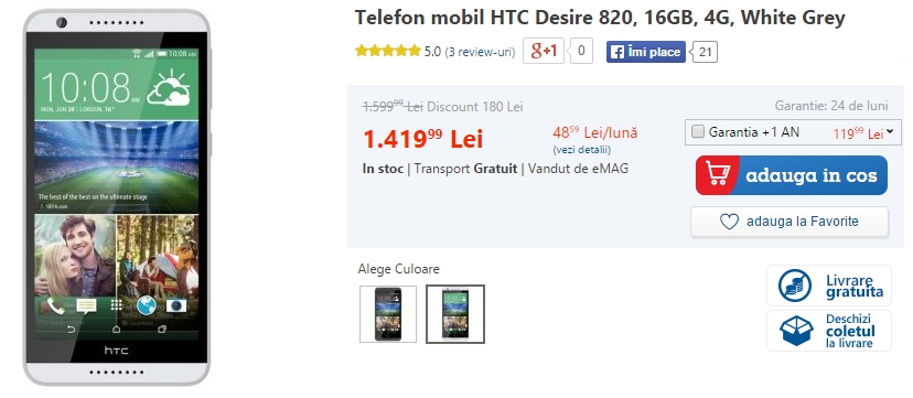 eMAG listează și phablet-ul HTC Desire 820 în nouă campanie, acesta primind un preț de 1.419 lei. Ni se oferă un display HD de 5.5 inch protejat de Gorilla Glass 3, 2 GB RAM, un procesor octa-core Qualcomm Snapdragon 615 și 16 GB de stocare + slot microSD.