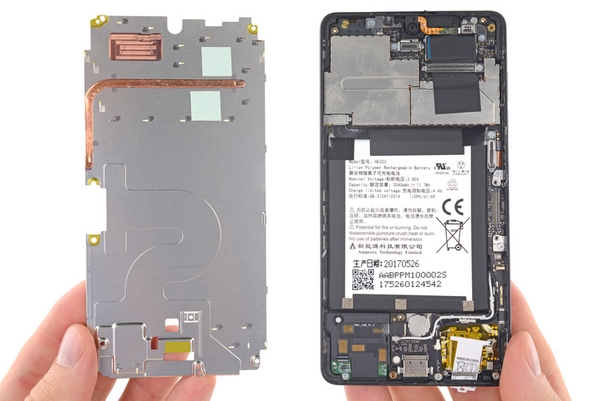 Cei de la iFixit au fost nevoiţi să îngheţe atât panoul din spate, cât şi ecranul pentru a putea să scape de adeziv. În acest procedeu ecranul a avut de suferit. La interior găsim o baterie fixată la rândul său cu mult adeziv. O problemă e şi cu faptul că portul USB Type-C este sudat pe placa de bază, deci înlocuirea sa de obicei banală e complicată.