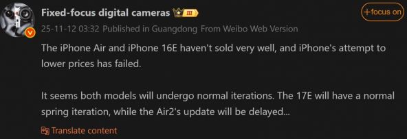 Zvonacul de pe Weibo, Fixed Focus Digital, scrie că iPhone 16e nu se vinde bine, exact ca iPhone Air. Chestiunea cu iPhone Air a fost demontată la un moment dat ca fake news şi am înţeles că a fost hit în Asia. Mai nou se discută despre un ciclu de upgrade de 2 ani, deci un iPhone Air 2 apărând prin 2027. iPhone 17e nu apare la anul, ci va exista un 18e tot în 2027, aparent.
