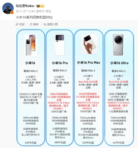 Modelele de top ar primi panouri OLED de 6.85 inch în diagonală, cu rezoluție 2K și margini plate. Vor primi baterie de 7500 mAh ce se încarcă la 100W pe fir, respectiv 80W wireless, senzori pentru amprente ultrasonici + certificare IP pentru rezistență la apă și praf. Xiaomi 16 Ultra ar primi o cameră periscopică de 200 MP, în timp ce 16 Pro Max se va alege cu un senzor principal mai mare de la OmniVision (1/1.28 inch), de 50 MP.