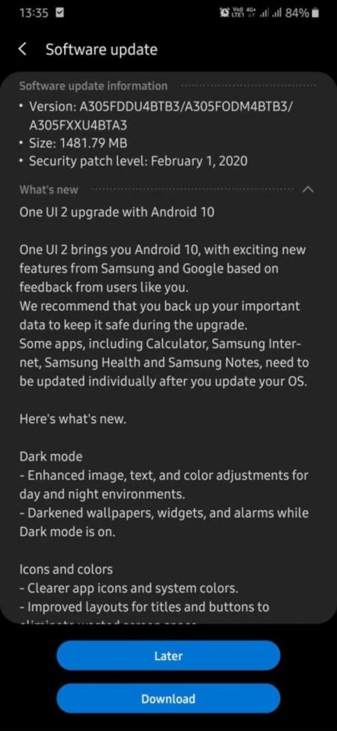 Descoperim că pachetul de actualizare poartă numărul de build A305FDDU4BTB3 și că acesta are aproximativ 4.58 GB. Se livrează cu patch-ul de securitate ce datează din 1 februarie 2020 și ca noutăți principale avem o interfață mai curată și mai ușor de folosit, elemente pop-up minimizate, dar și un layout mai smart pentru o experiență vizuală mai confortabilă.