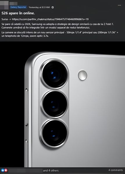 Pe grupul Samsung Galaxy România a apărut recent prima randare cu iz realist pentru Galaxy S26, varianta de bază din lineup-ul de flagship-uri ce ar trebui să sosească la începutul anului viitor. Schimbările sunt minore, după cum era de așteptat, dar câteva elemente par preluate de la noile pliabile Galaxy Z Fold7 și Z Flip7. Despre ce e vorba?