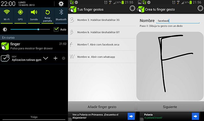 în meniul de configurare, putem seta gesturile aferente activării sau dezactivării unor funcții sau aplicații. Putem redenumi fiecare gest pentru management mai eficient al listelor pe care le putem creea. Pasul doi se referă la activare a ceea ce dezvoltatorul numește “Finger Drawer” - un ecran plutitor oriunde pe ecran, a cărui transparență poate fi ajustată. în cadrul acestuia putem realiza gesturile personalizate în prealabil, pentru a avea rezultatul dorit. încă un motiv să apreciați aplicația - este oferită gratuit prin intermediul Play Store.
