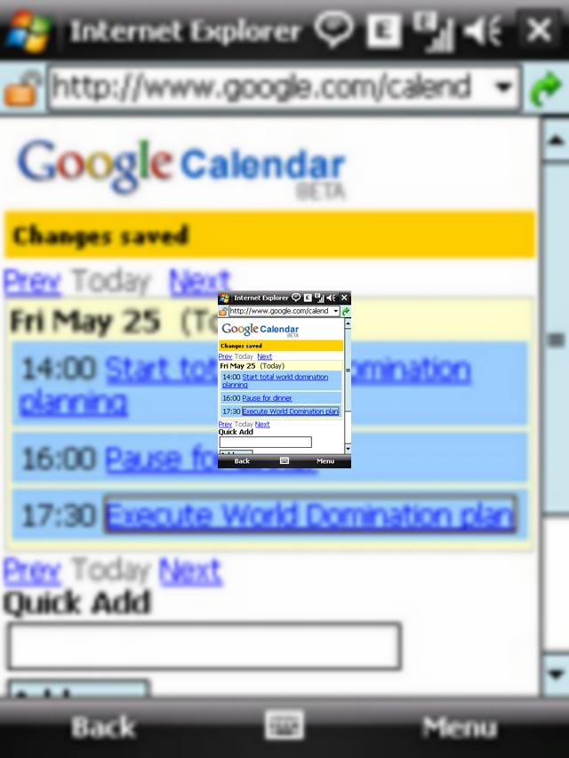 Serviciul functioneaza perfect, afisand o lista cu planurile tale zilnice, desi din pacate nu exista inca o metoda de a sterge un event dupa adaugarea sa. Astfel de eventuri pot fi adaugate prin folosirea ferestrei "Quick Box" din partea inferioara a ecranului. Va trebui doar sa descrieti ce implica acel event, o intalnire de afaceri, cumparaturi cu sotia sau o bere cu prietenii.