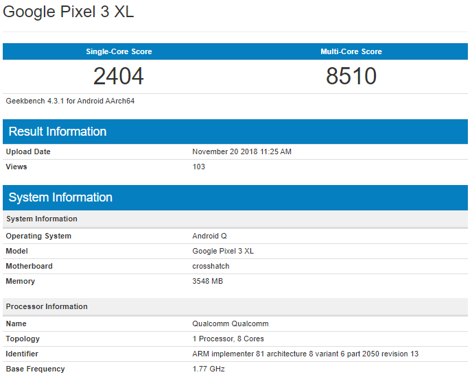 Din listarea GeekBench remarcăm faptul că la nivel de performanță creșterile sunt minore, asta ținând cont că telefonul obține rezultate similare și cu Android 9.0 Pie instalat la pachet. Cu Android Q ajunge la un scor single-core de 2404 puncte, în vreme ce la testul multi-core se obțin 8510 puncte.