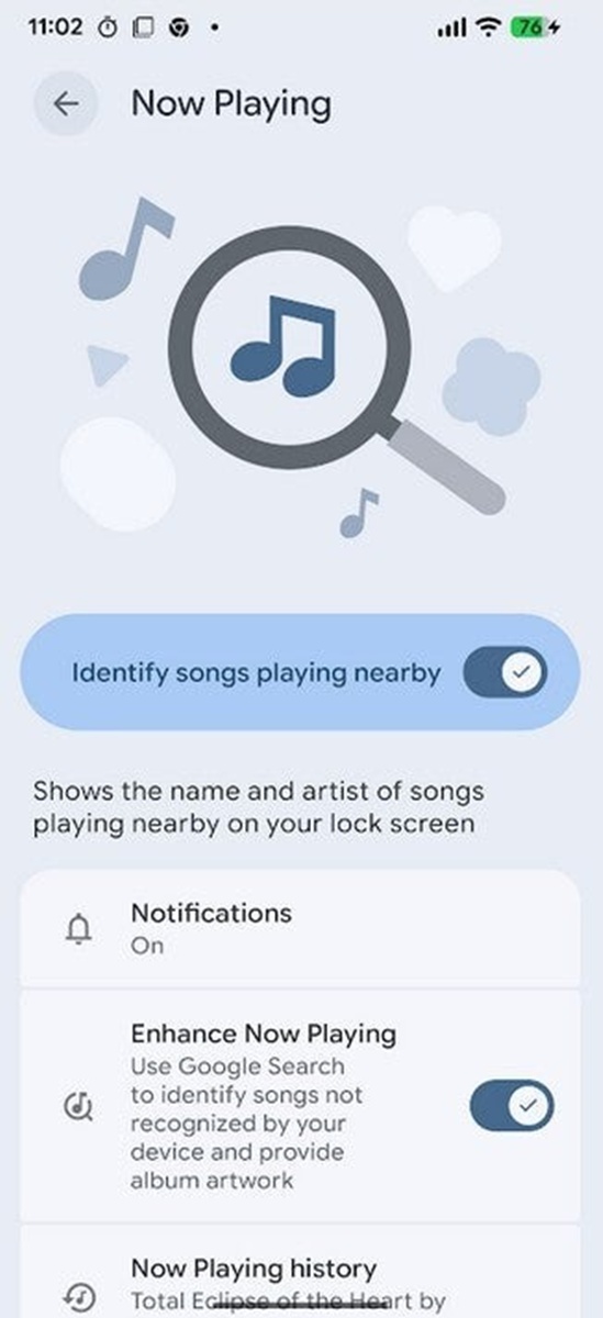 Pentru moment opțiunea poate fi activată din zona de setări, din submeniul Sound & Vibration. Există și „Enhance Now Playing” ce folosește Google Search pentru a identifica piesele pe care sistemul nu le poate recunoaște local, adâugând inclusiv artwork-ul albumelor. Utilizatorii au posibilitatea să consulte istoricul melodiilor identificate și pot deschide rapid piesele în aplicații de streaming audio (YouTube Music, Spotify, Apple Music).
