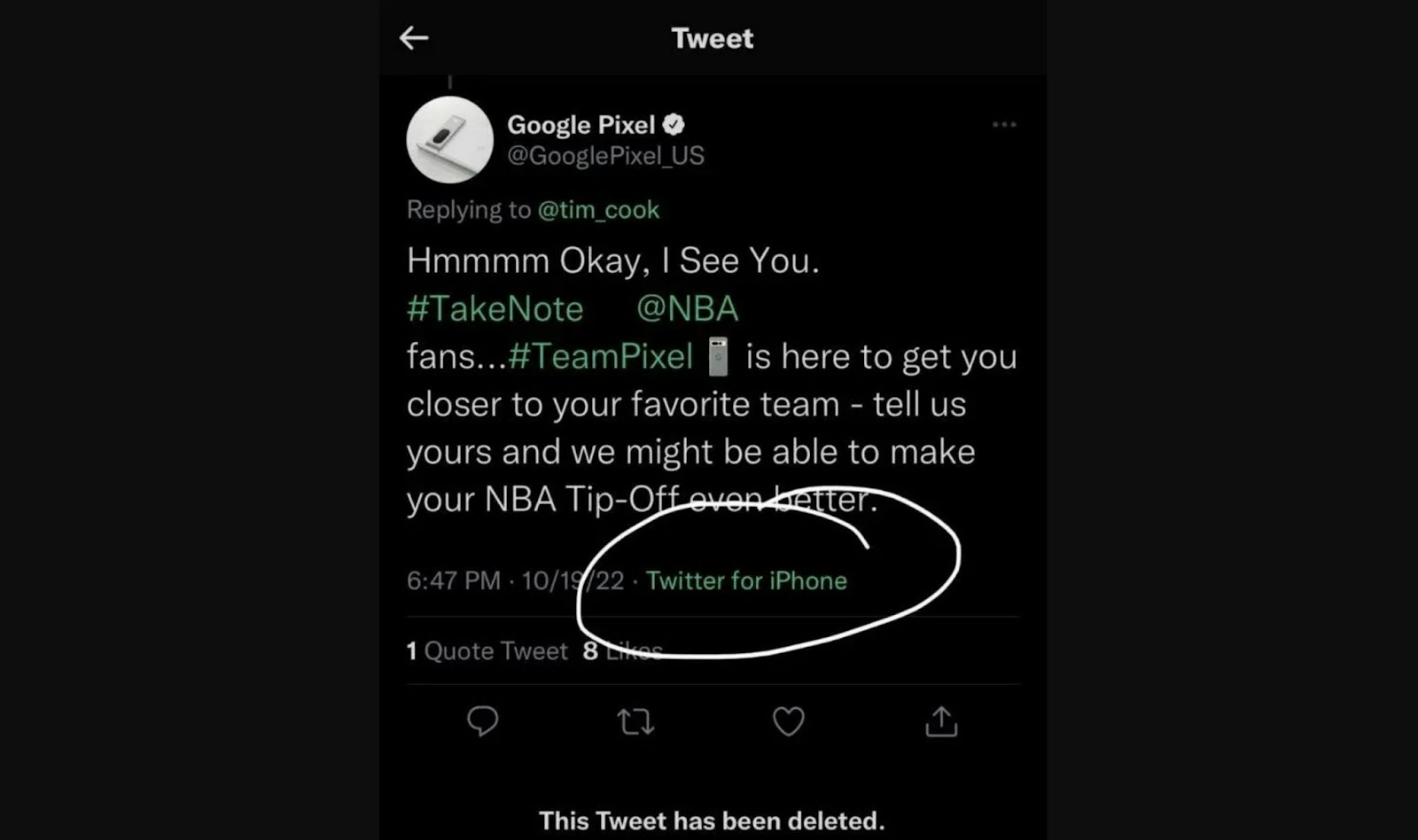 Ce e mai amuzant e că postarea era o replică chipurile acidă dată lui Tim Cook cu privire la furnizarea de scoruri şi informaţii despre NBA cât mai rapid. Răspunsul venea la anunţul lui Tim Cook cu privire la iPad Pro M2 lansat săptămâna asta.Şi Samsung a făcut ceva de gen recent: în ianuarie a folosit iPhone-uri pentru a promova evenimentul Galaxy Unpacked, iar în 2018 a folosit tot un telefon Apple pentru a promova ecranul lui Galaxy Note 9.