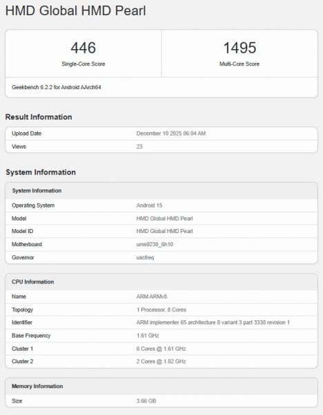 În Geenbench 6.2.2 vedem terminalul sub numele de cod „Pearl” cu doar 4 GB de memorie RAM. Asta indică semne întrebare cu privire la suportul pentru Android 16, care are nevoie de minim 6 GB pentru a rula în variantă completă. Fie HMD va opta pentru varianta Go Edition, fie va tăia din funcțiile Android pentru a-l face să ruleze optim.