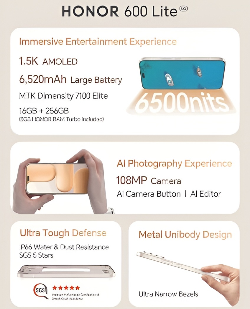 Honor 600 Lite este echipat cu un ecran AMOLED de 6.6 inch în diagonală, cu rezoluție 1.5K și refresh rate de 120Hz. Un alt element interesant este luminozitatea maximă declarată, care poate ajunge până la 6500 nits, un nivel foarte ridicat pentru un terminal accesibil. Sub capotă descoperim un procesor MediaTek Dimensity 7100 Elite, 12 GB RAM și 256 GB de stocare. Unul dintre punctele forte ale telefonului este bateria generoasă de 6520 mAh, care promite o autonomie serioasă. Alimentarea se realizează la 45W pe fir.